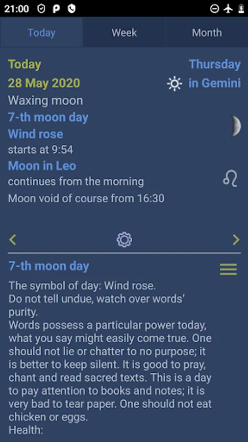 - additional lunar aspects information on dreams, meditation, relationship, business, gardening, nutrition and housework