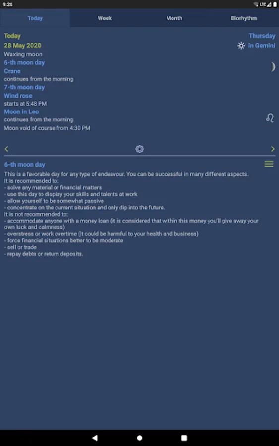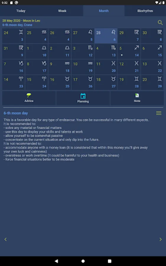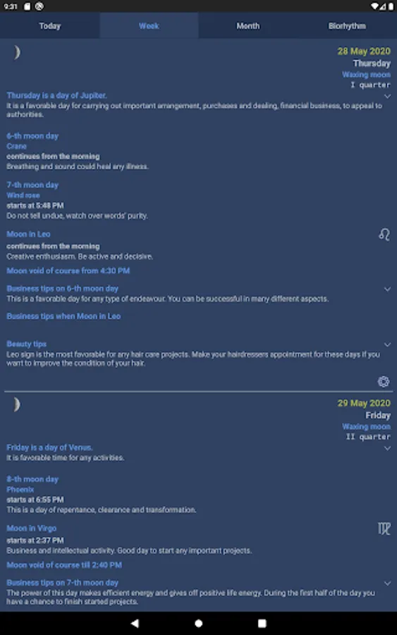 - search for a favorable day (haircutting, hair coloring, business, sauna & massage, gardening, etc.)
