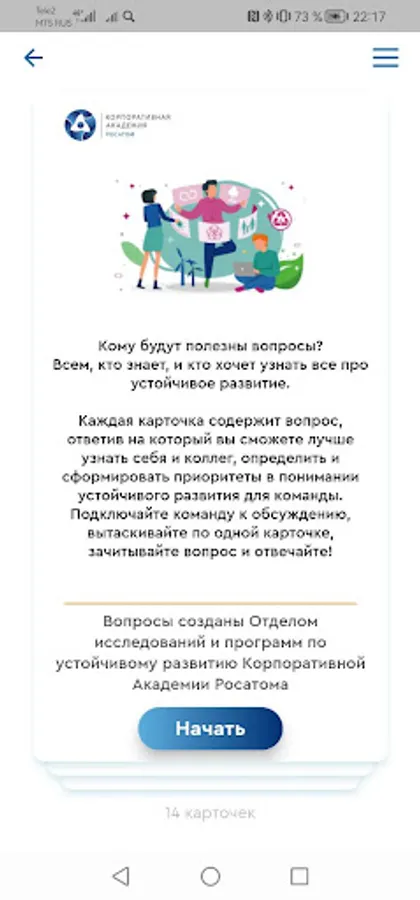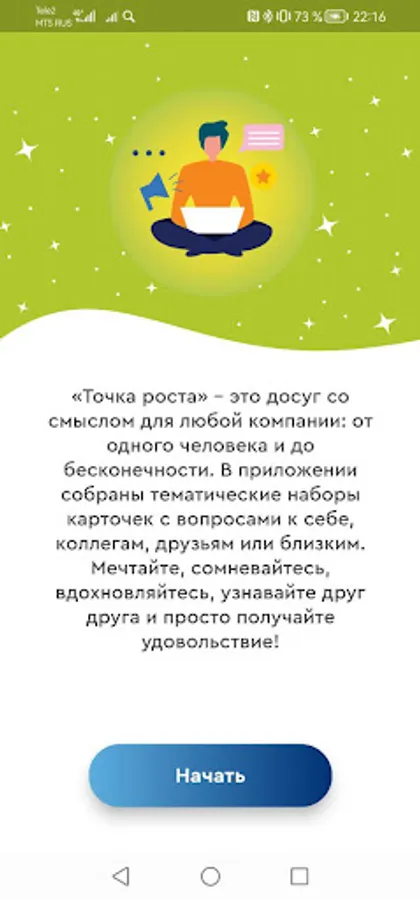 "Growth point" is leisure time with meaning for any company: from one person to infinity. The application contains thematic sets of cards with questions to yourself, colleagues, friends or relatives. Each set contains 40 question cards. After reading the question, you will smile, reflect, reflect, but you will definitely not remain indifferent! Dream, doubt, be inspired, get to know each other and just have fun!