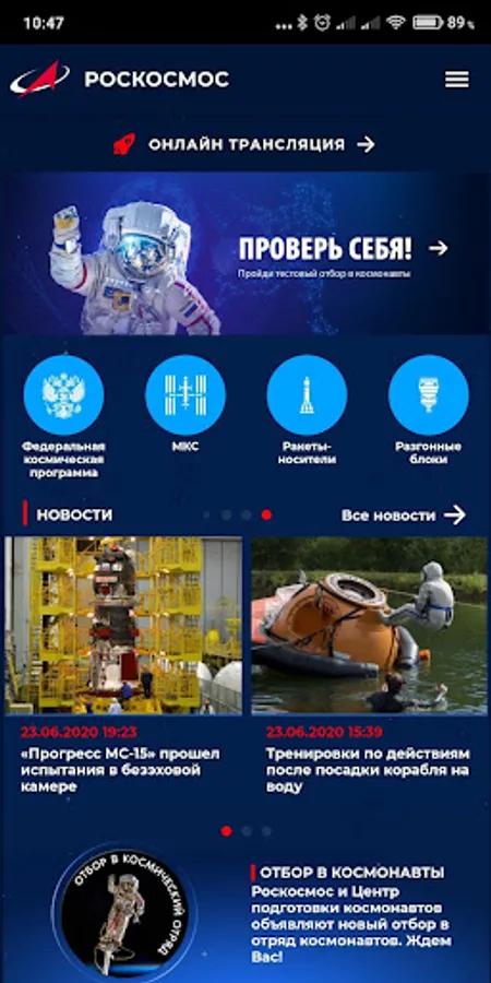 The state corporation "Roskosmos" presents the official application for mobile devices. Interesting information, news, videos, announcements and video broadcasts of important events are now always with you.