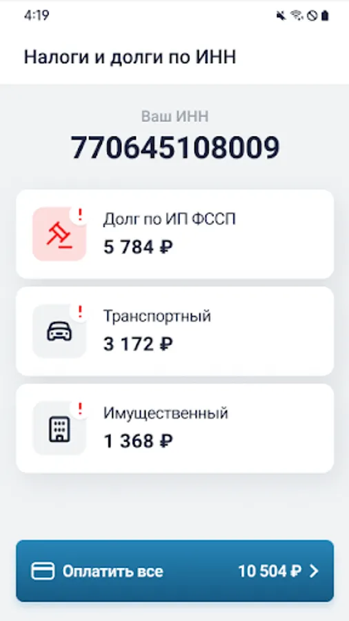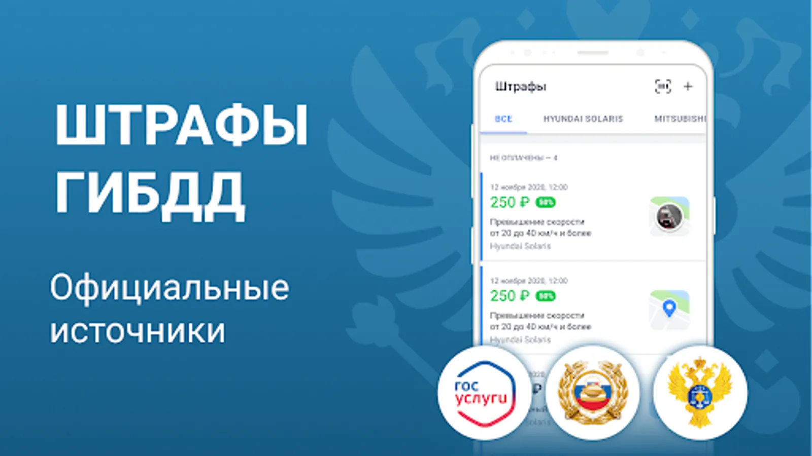 Find out about your traffic police fines in a timely manner and pay them with a 50% discount using our application. We use only official sources - traffic police online (gibdd.ru), GIS GMP, FSSP. Therefore, all data on fines and taxes (check on rights and STS) are reliable. In the application, you can not only check and pay a traffic police fine, TsODD or fines from cameras, but also find out the transport tax and other taxes by TIN. If you do not remember your TIN, then you can find it in the passport application for free.