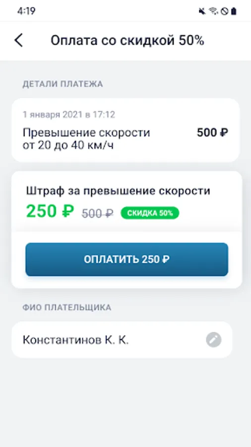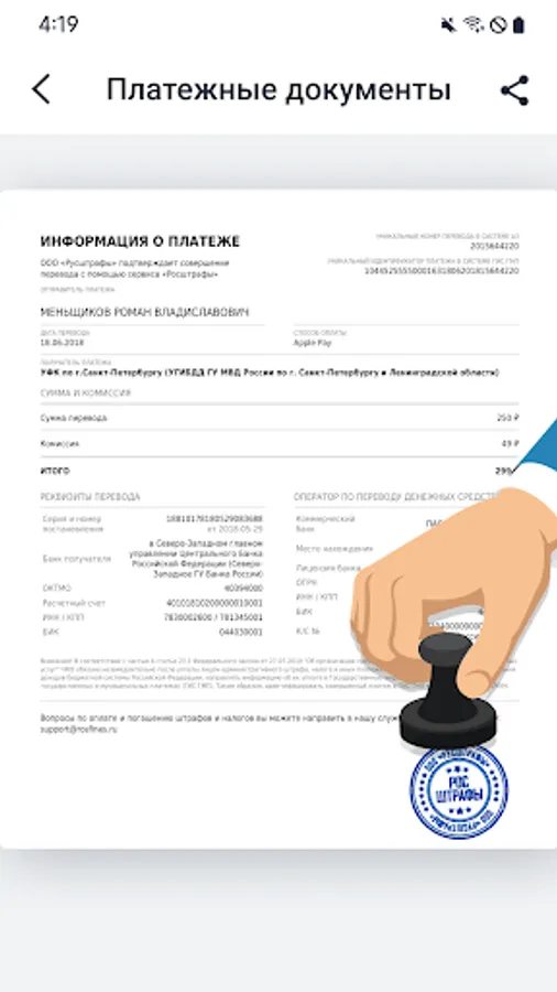 Car fines from cameras and fines from the TsODD (parking fines or fines from MADI) can be paid with any bank card directly in the application, as well as through the SBP - quickly and conveniently! This way of paying fines and taxes will especially appeal to people who value their time and appreciate high quality service. The commission that we charge for paying fines allows us to provide the highest level of service, always notify about fines and taxes on time, and also give extra. information on fines, including photos of violations.