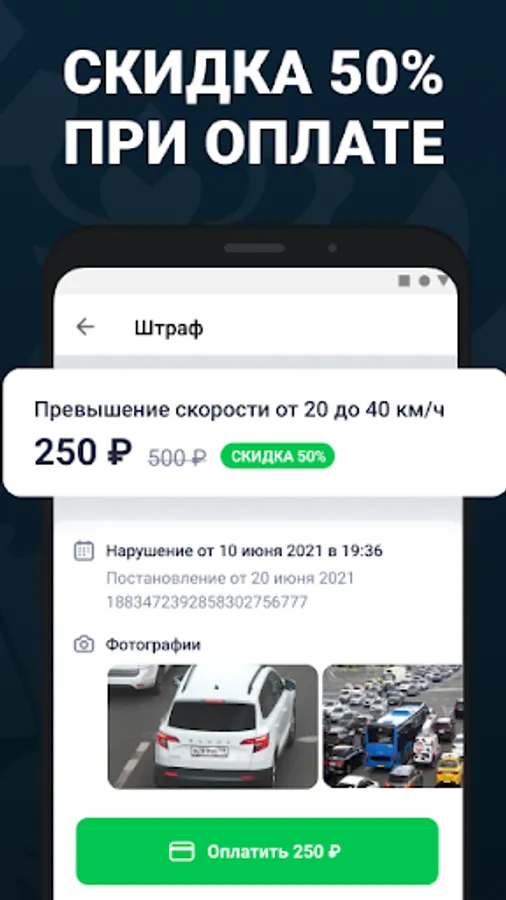 • automatic notification of fines immediately after their registration in the traffic police database, so that you always pay only half the amount (when setting up push notifications and email notifications);