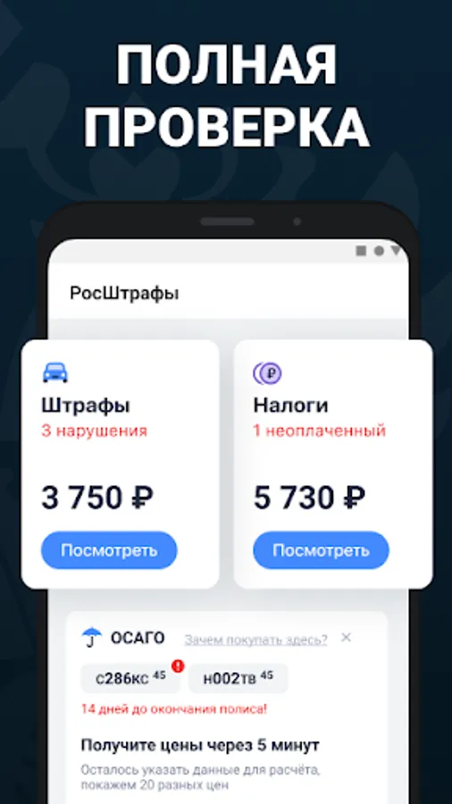 You get an application connected to the official databases of the traffic police, GIS GMP, FSSP, DIT. This means that any information is absolutely accurate and reliable, and payments will never freeze.
