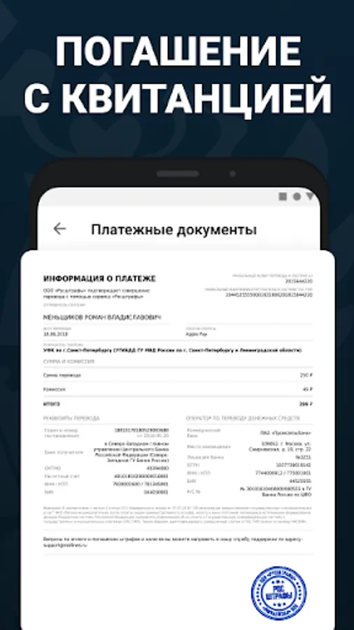 • an official receipt for each payment — it is stored in the application and sent to the post office (money transfer services are provided by PJSC Promsvyazbank, license of the Bank of Russia No. 3251);