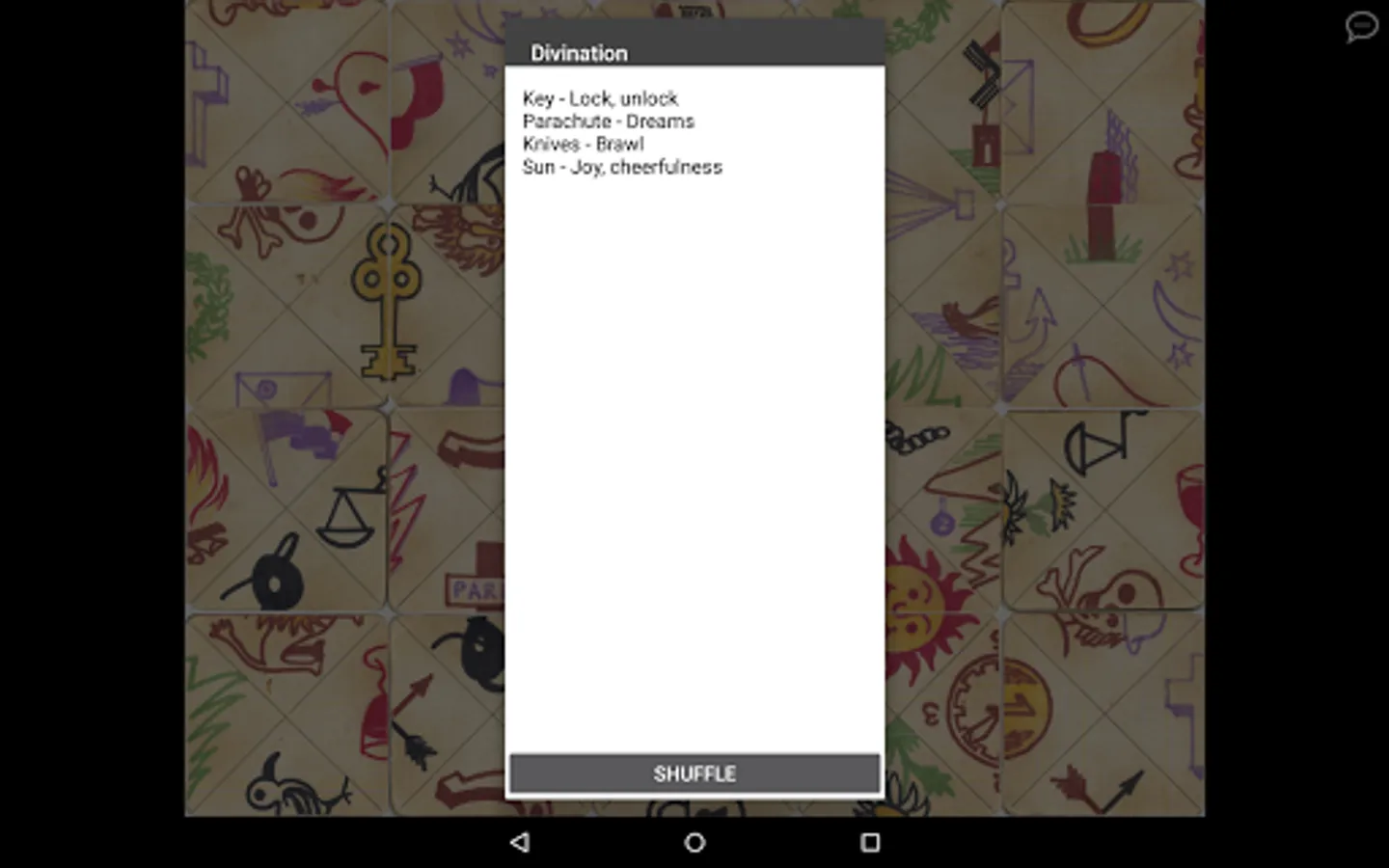 Mix the cards and lay out face down (phone or tablet will do this for you). Open image in a order and rotate it so that the pictures will have coincide. When all the cards open, you can see what it means to one or another picture. And then space - for imagination and interpretation. Ultimately, the future depends on you.