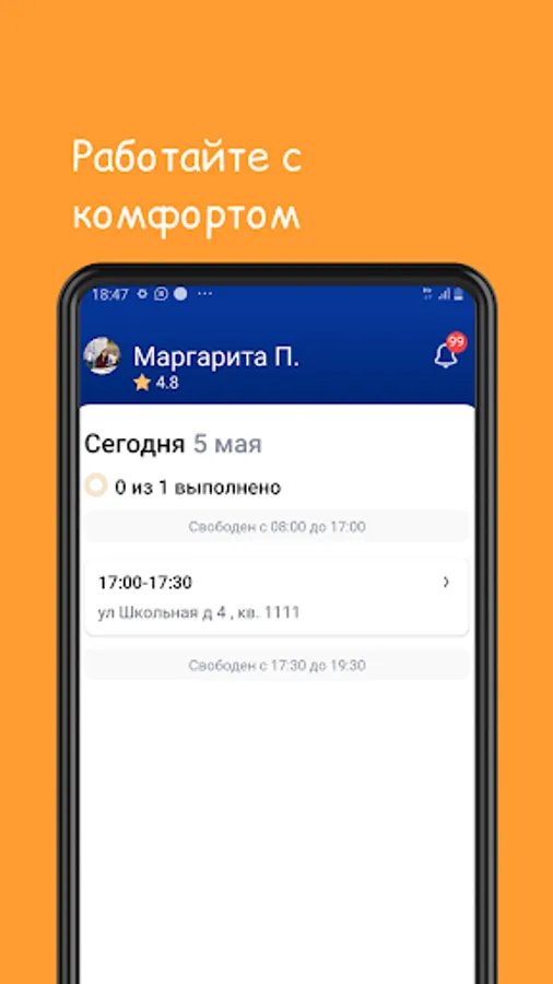 The application is intended for employees of "Rossiyanka Apart". Using the application, the employee has the opportunity to notify the dispatcher about the fulfillment of applications and create them on his own, chat with the owners, and track his rating.