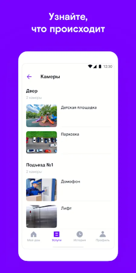 - Integrated video surveillance allows you to view the broadcast and archive recordings from cameras installed in the courtyard and on the territory adjacent to the house, playgrounds, yard parking lots, at the entrances of your house.