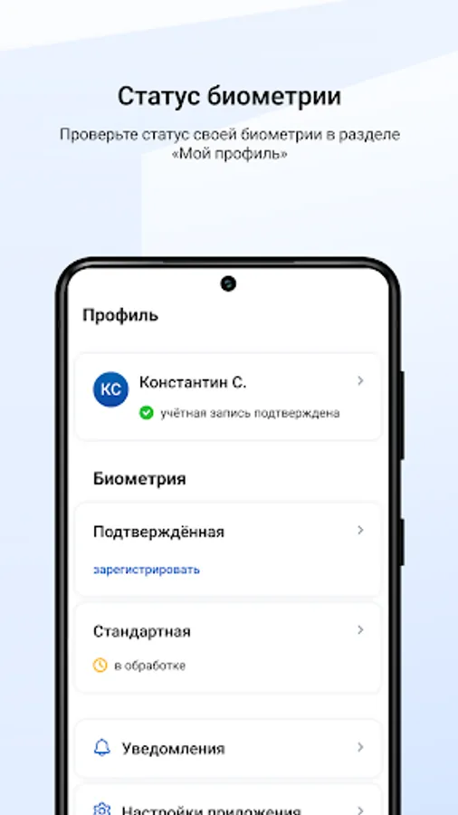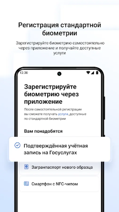 1. Using the mobile application "Gosuslugi Biometrics" you can register standard biometrics. To do this, in the application, click on "Surrender biometrics" and follow the prompts. You will need a verified account at the State Services, a new passport and a smartphone with an NFC chip.