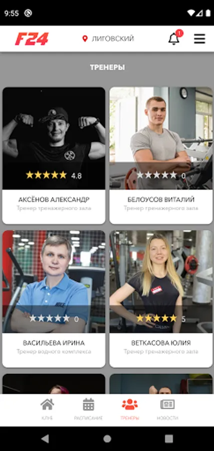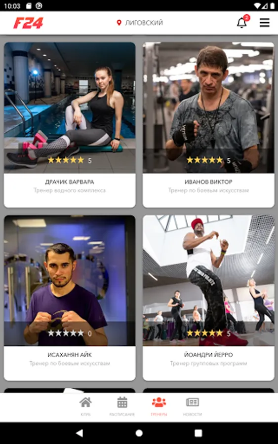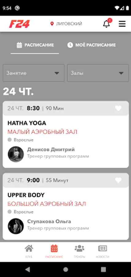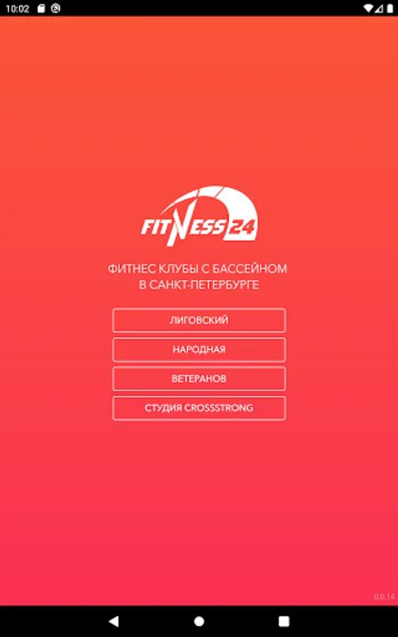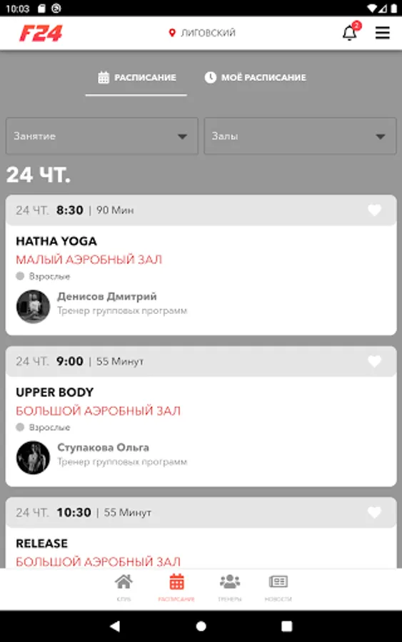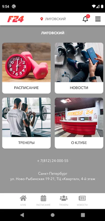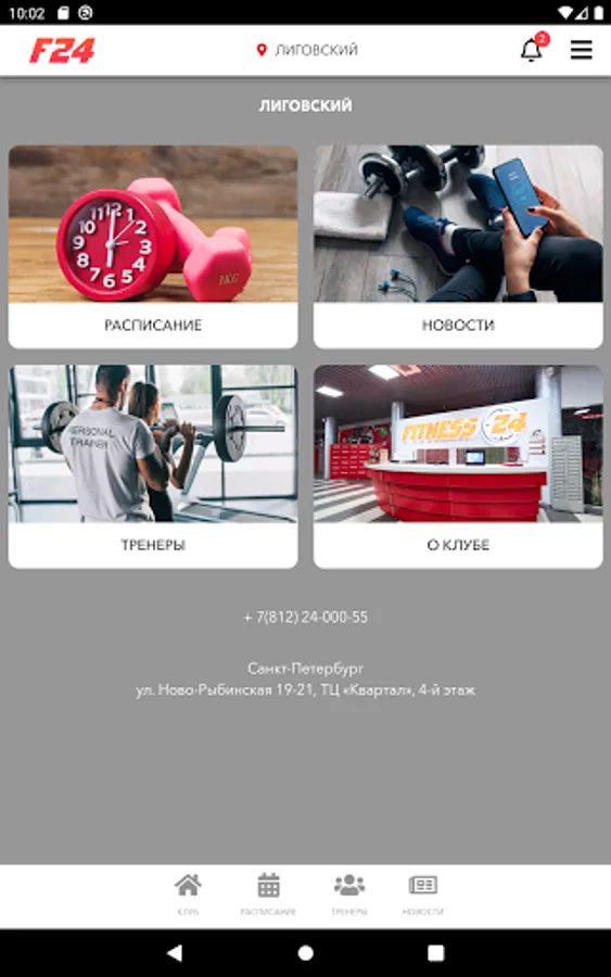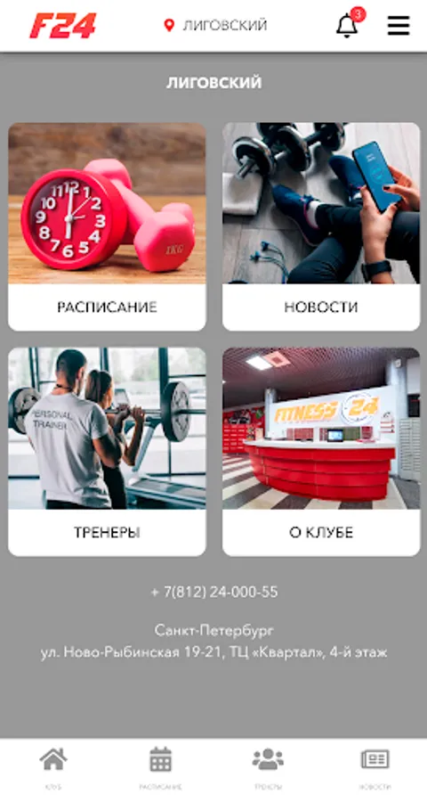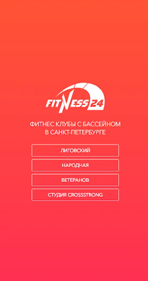 Application of the network of round-the-clock sports clubs FITNESS 24 (St. Petersburg). Providing access to the schedule of classes, club news.