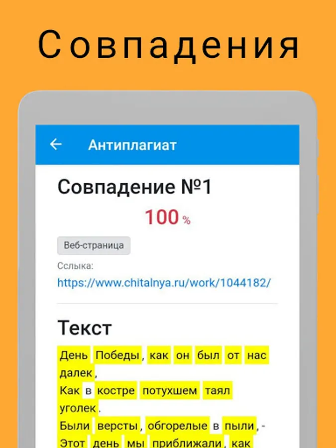As a result of the check, the text is highlighted with a yellow marker, so you can clearly see which part of the text was marked as plagiarism. The percentage of uniqueness of the text is also highlighted, there are many other characteristics of the text.