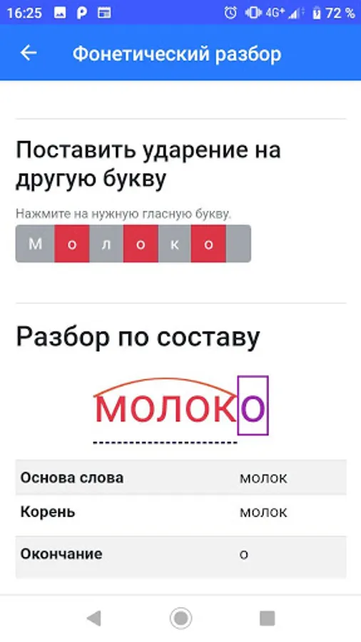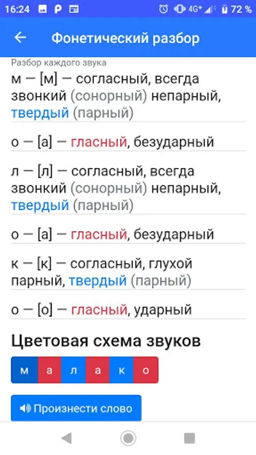 Parses each letter. Records its sound and describes: vowel - stressed / unstressed, consonant - hard / soft (paired / unpaired), voiceless or voiced (paired / unpaired)