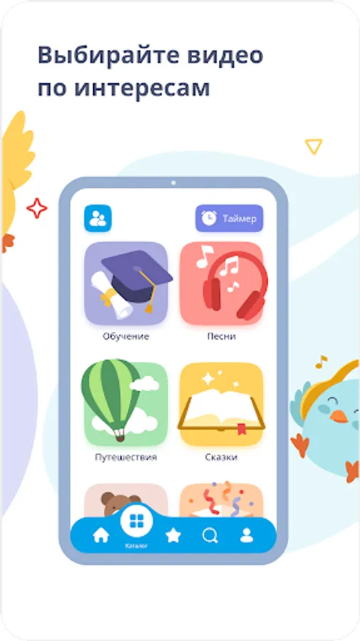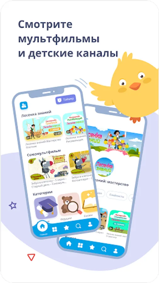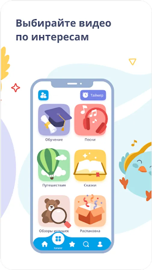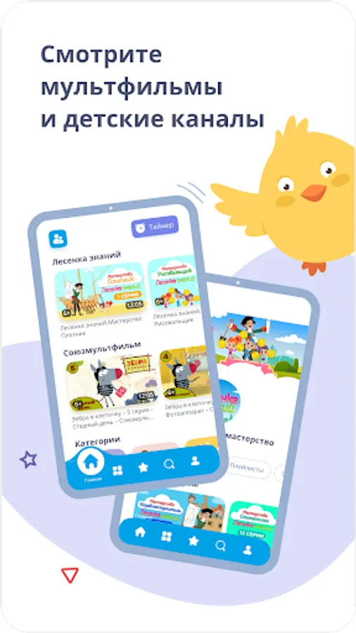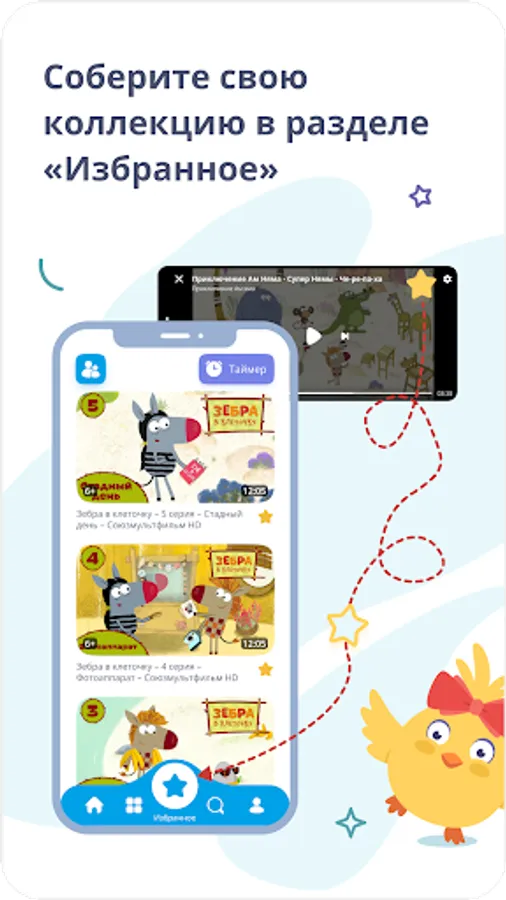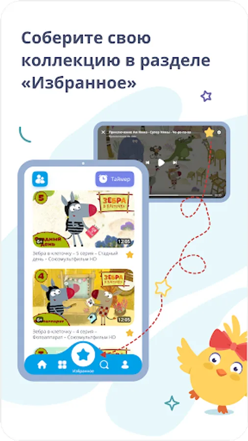 Create one or more child profiles and choose from 7 colorful characters for each. Change the background to your baby's favorite color, add an affectionate name to the profile name. Star your favorite cartoons and animated series to add them to "Favorites" and quickly find them in the application. The function will also be useful for parents of kids - mark the content that you recommend or allow to watch.