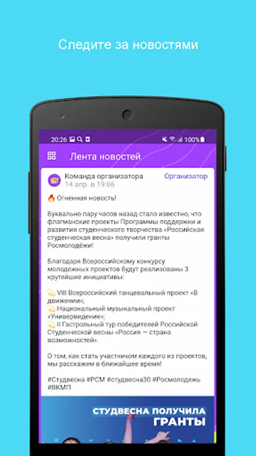 The official application of the anniversary 30 All-Russian festival "Russian student spring". Thanks to him, you will be able to: