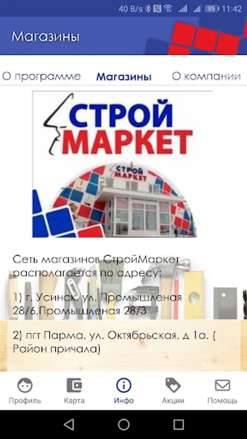 The StroyMarket chain of stores is located at the address: Usinsk, st. Promyshlennaya 28/6, Promyshlennaya 28/3, village of Parma, ul. October, d 1a.