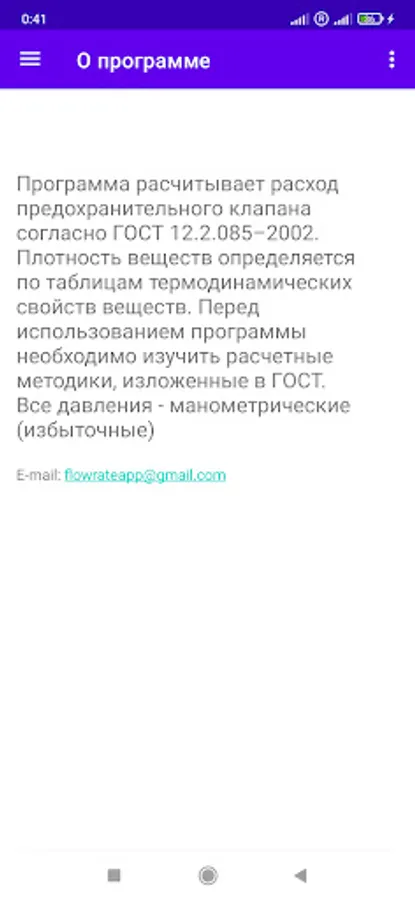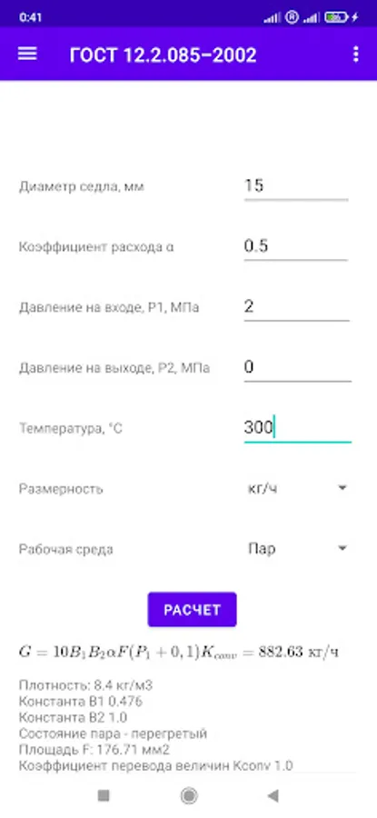 The program calculates the capacity of the safety valve in accordance with the methods set forth in GOST 12.2.085-2002. To perform the calculation, it is necessary to set the parameters of the safety valve (flow rate, seat diameter) and the parameters of the working medium.