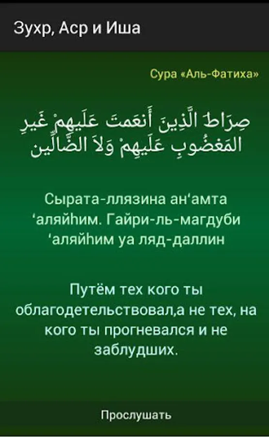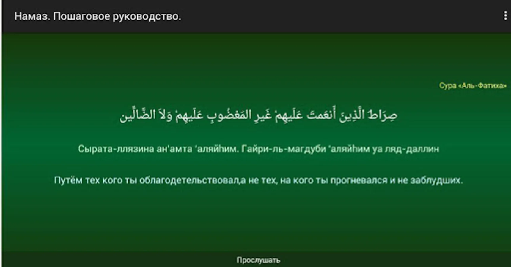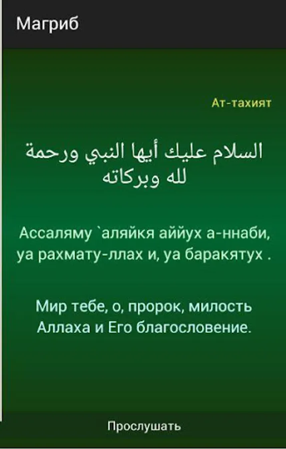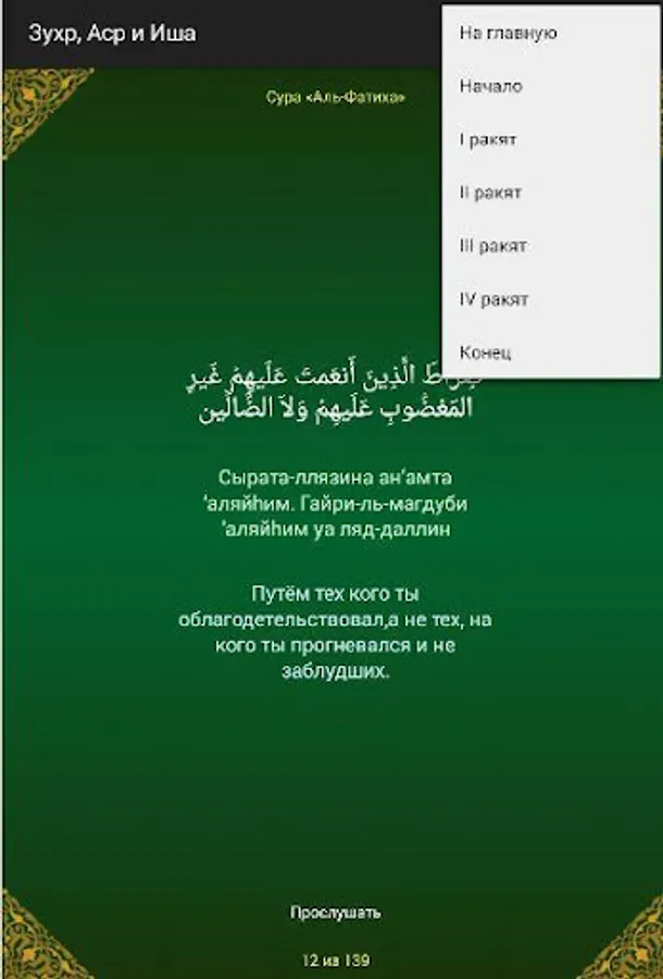 The text is presented in the original language (Arabic), supplemented by transcription and translation. It also has audio recording of each phrase to listen to a professional reading namaz.