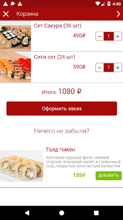 The application of the restaurant "Delivery Service SAKURA" allows you to arrange delivery of the order home or office. With this application you can place an order in 3 clicks. Save personal information in order not to waste time on re-entering it into the order form. Add your favorite dishes to your favorites and follow the history of your orders!