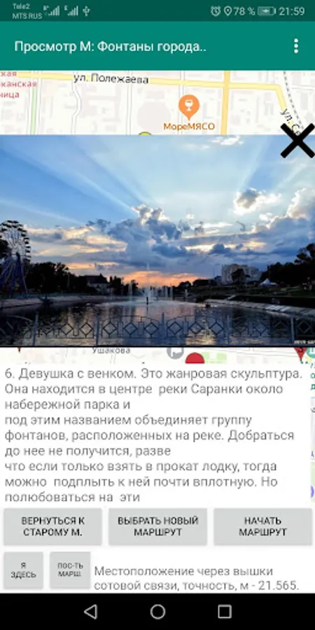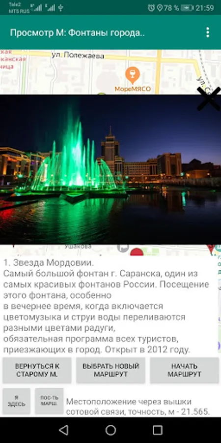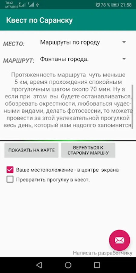 You can walk around and find interesting places in the city using this application. Learn a lot of new and interesting things about the city, turn a walk into a quest. As you get from one point to another, information about this point and a quest with answer options will open to you. But you can only find out if you answered correctly when you find yourself at a certain point.
