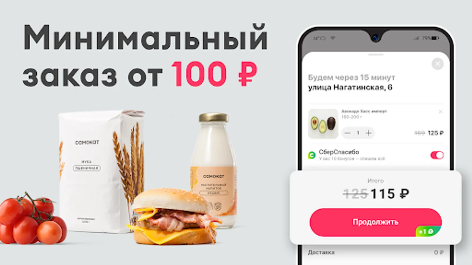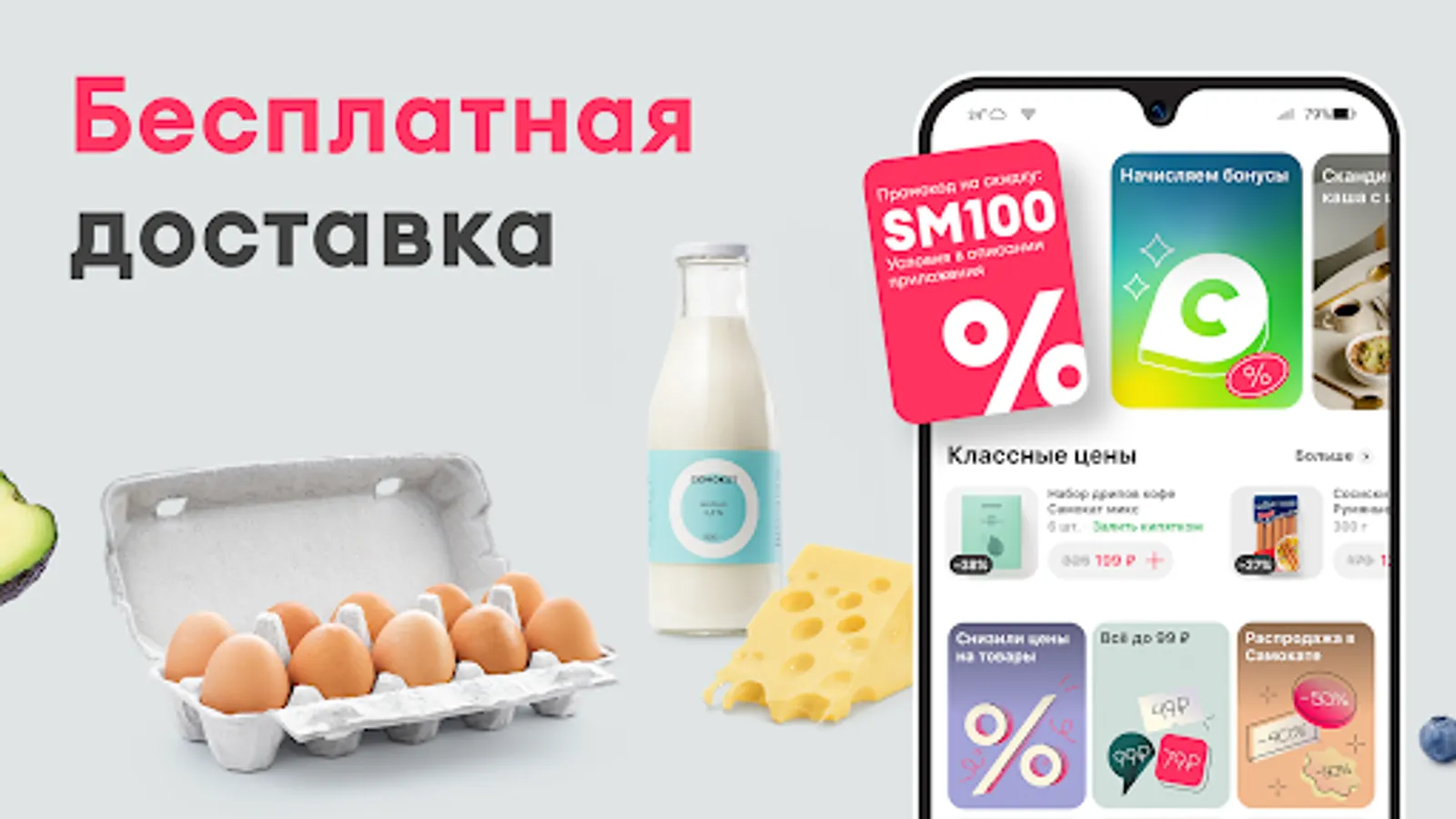Мы проводим акции и каждый день обновляем скидки на продукты и напитки. Например, промокод SM100 даёт скидку 100 ₽ на три первых заказа. Акция действует, если оформить доставку продуктов на дом от 800 ₽.