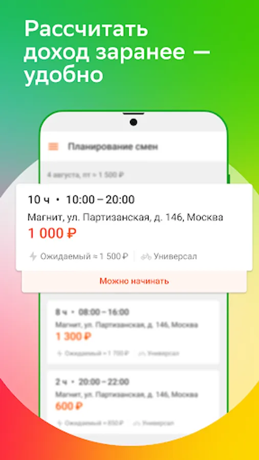 Plan your schedule, complete orders and earn income. The application is very easy to work with - you can take shifts, monitor order statistics, check your balance, and even nice bonuses are waiting for you inside. Join right now!