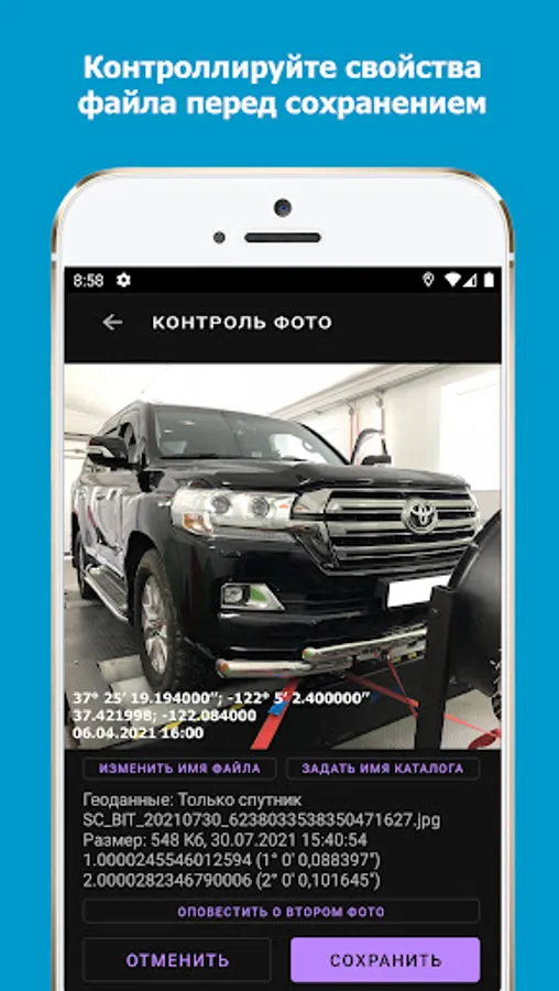 The application "Photo for Technical Inspection" is designed to simplify sending photos, in accordance with the order of the Ministry of Transport of the Russian Federation on the requirements for a photographic image of vehicles in respect of which technical diagnostics were carried out.