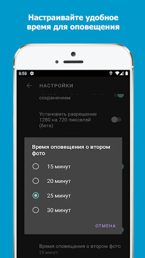 This application allows you to perform photo fixation in accordance with the requirements in one of three ways: timer + tripod, selfie stick, stationary IP cameras. There is also support for a bluetooth button to remotely trigger the camera.
