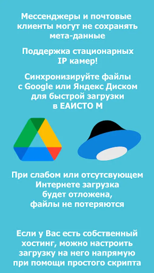 IMPORTANT: do not use instant messengers or email clients to transfer the file from the device to the computer for further downloading to EAISTO-M, as they do not save the meta (exif) properties of the file, and you may receive errors.