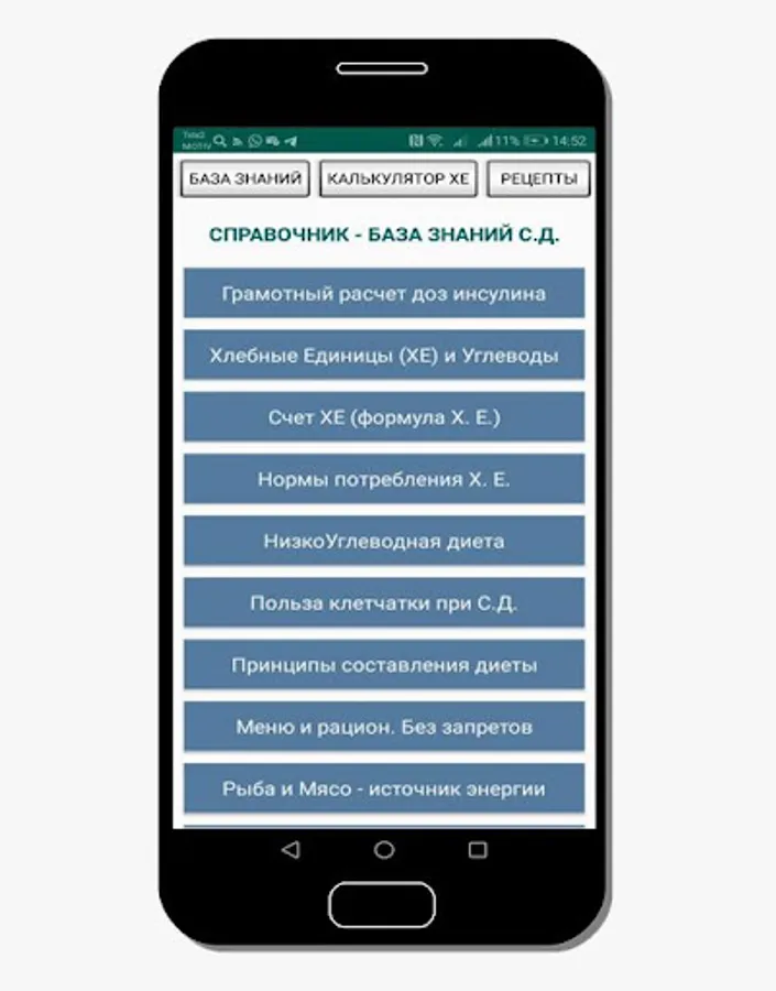 2. The knowledge base is a guide within the application that will always remind you how to choose the right dosage (coefficients) of insulin, tell you how to avoid complications and maintain a high quality of life without strict restrictions.