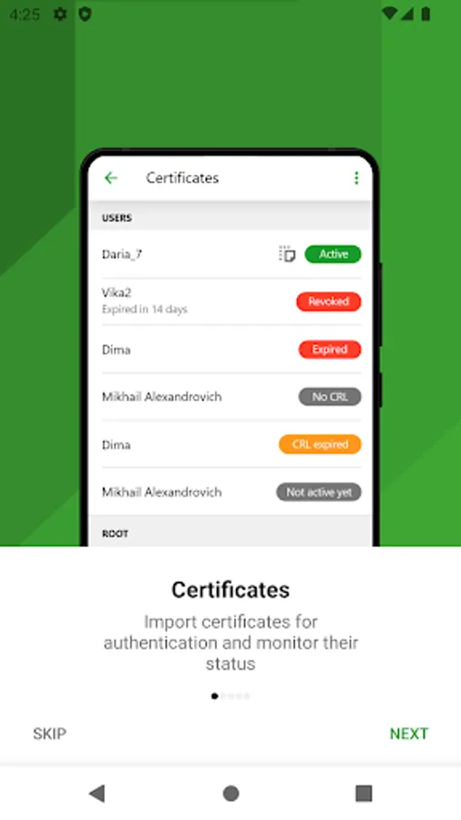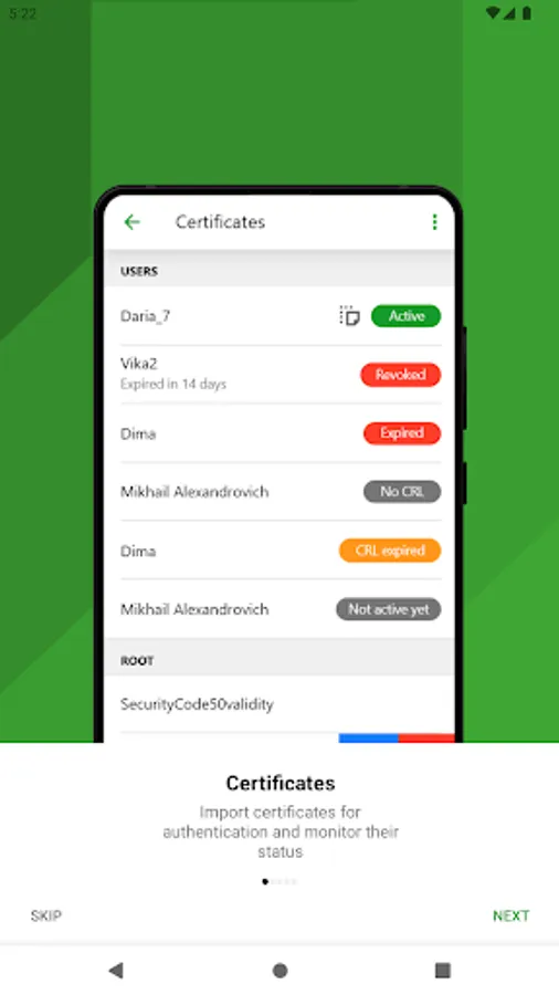 While establishing a connection between Continent-RA and Continent Access Server, remote users are identified and authenticated using public key certificates.