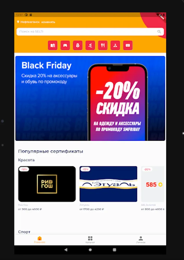 Using our convenient application, you can purchase certificates with discounts from 30% from our partners - stores of popular brands of clothing, shoes, appliances and others. Store certificates in the application. To activate the certificate, show the barcode from the application to the cashier.