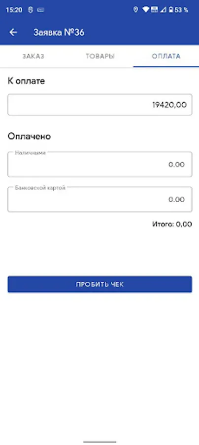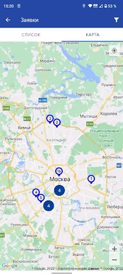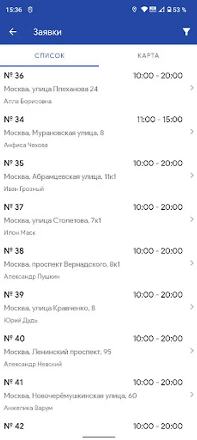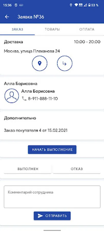 The application is designed to receive route sheets and work orders, track the order of applications, transfer information about order statuses, and view customer contact information. The application builds the optimal route of movement and tracks the trajectory of movement.
