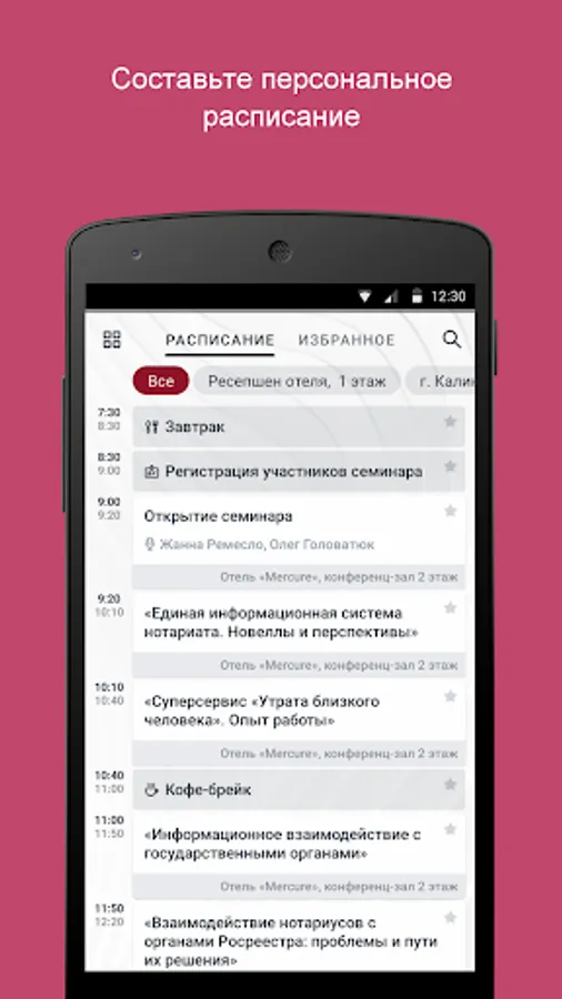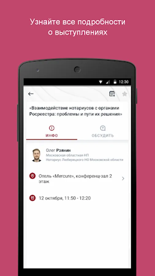 The official application for the events of the Federal Notary Chamber, where you can follow the schedule update in real time; communicate with event participants through the application; find out the details of the reports and ask the speakers questions; access the downloaded content.