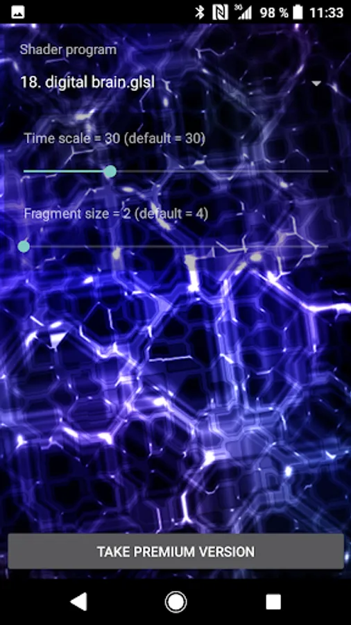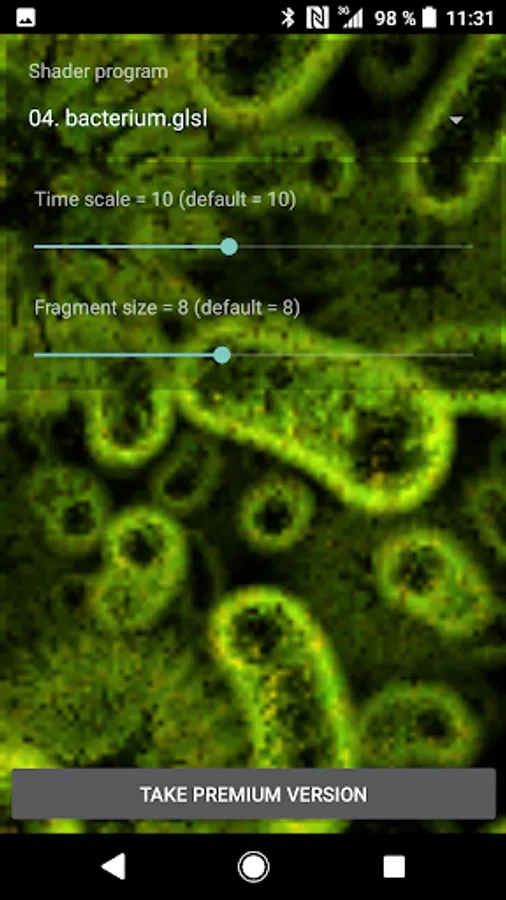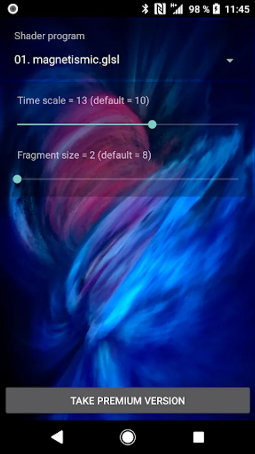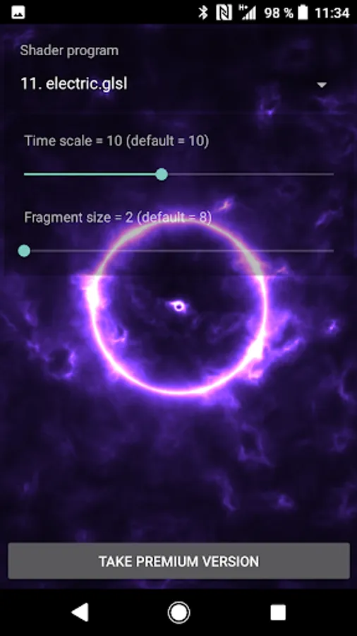 This is a live wallpaper application. Contains various shader programs with settings and effects.