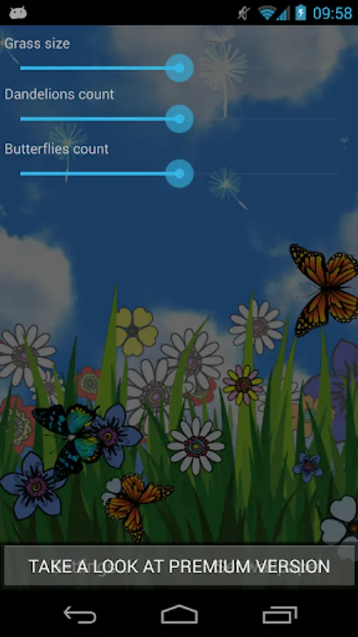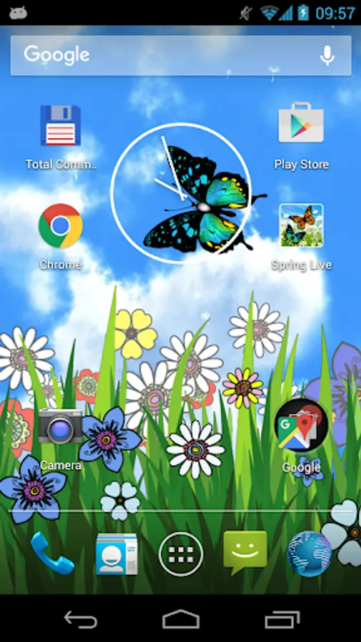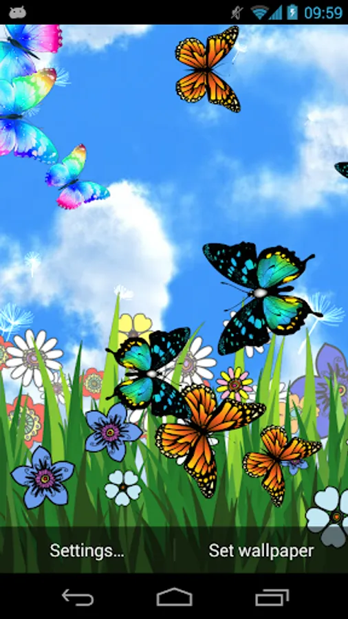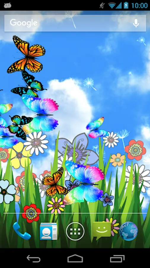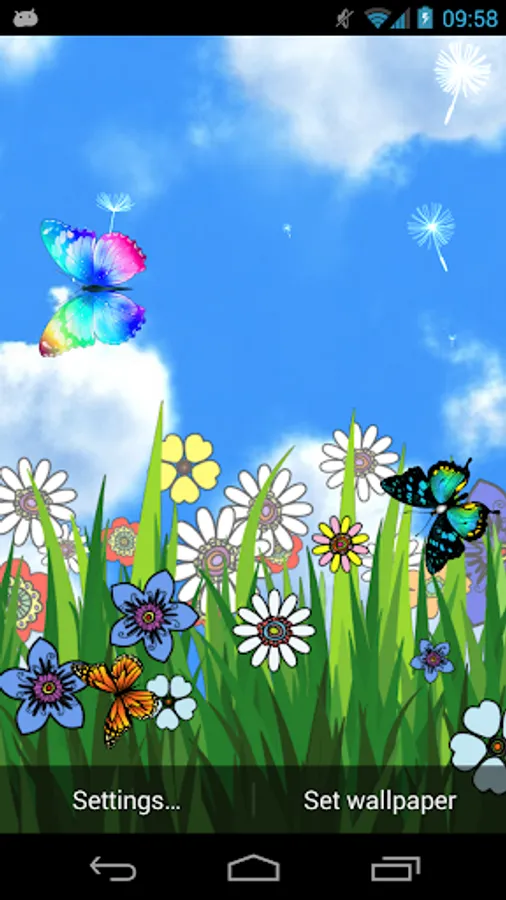 This is a spring live wallpaper with flowers, dandelions, butterflies and sky.