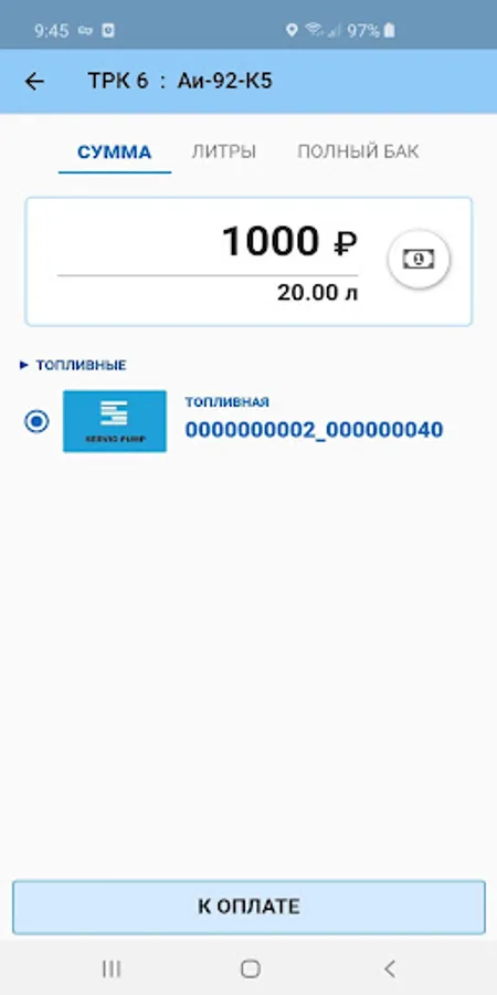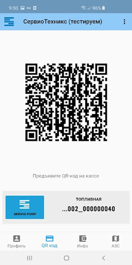 • Instead of cards, show the dynamic code on the smartphone screen at all registered gas stations with installed Servio Pump ACS.