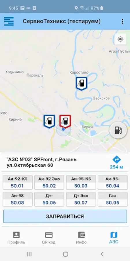 • Find the nearest gas stations on the map in the application. Find out fuel prices and build routes.
