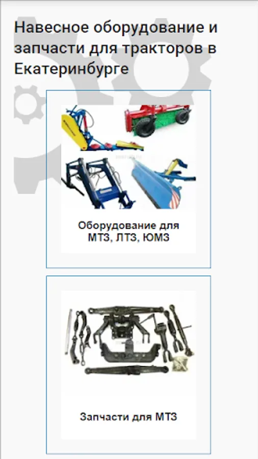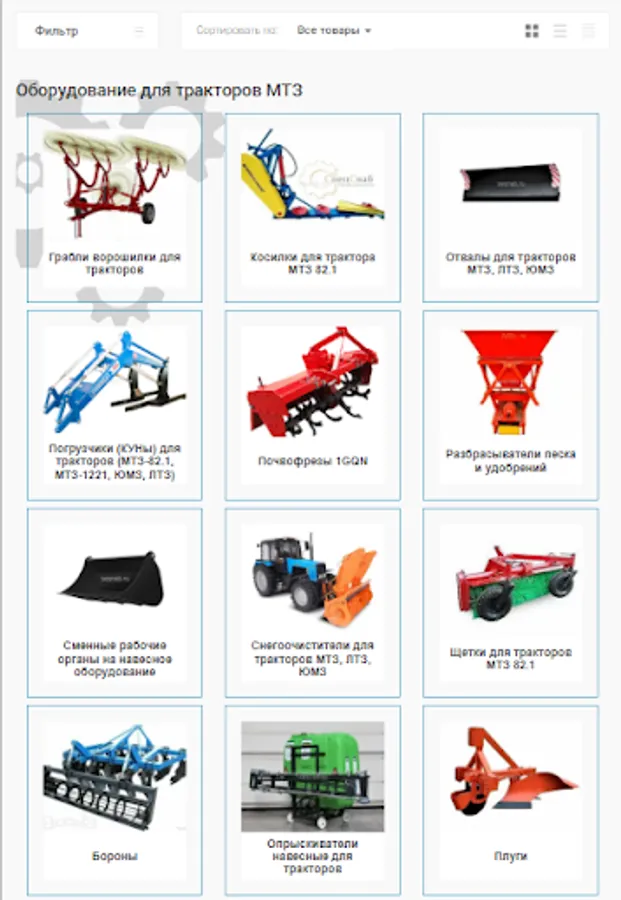 The catalog contains: spare parts for MTZ, spare parts for YuMZ, spare parts for LTZ, MTZ clutch, spare parts for the D-240 engine, MTZ gearbox gearbox, MTZ front axle, MTZ headlights, spare parts for agricultural machinery, spare parts for the Belarus tractor, spare parts for special equipment, dumps, tillers, loaders, mowers, equipment for MTZ, LTZ, YuMZ; turbochargers, tractor steering, MTZ rear linkage and MTZ components, MTZ cab, tractor body parts, tractor accessories, rakes, tedders for tractors, mowers for MTZ 82.1 tractors, mouldboards for MTZ, LTZ, YuMZ tractors; loaders (KUNs) for MTZ-82.1, MTZ-1221, YuMZ, LTZ tractors; 1GQN rototillers, sand and fertilizer spreaders, interchangeable working bodies for attachments; snowplows for MTZ, LTZ, YuMZ tractors; brushes for MTZ tractors, harrows, spare parts for attachments, spare parts for agricultural brushes, spare parts for KUHN loader, spare parts for blades, snow plows and technical plates, spare parts for rotavators, spare parts for KRN mowers, fingers (teeth) of mowers, balers, spare parts for balers, spare parts for agricultural sprayers, sprayers for tractors, Melitopol hydraulic cylinders, Profmash hydraulic cylinders, China hydraulic cylinders, repair kits for hydraulic cylinders, spare parts for seeders, brush discs, spare parts for road cutter (FD-567), spare parts for WIRAX mowers ( virax), spare parts for plows and cultivators, grader knives, spare parts for a sewage machine, spare parts for KO-503, spare parts for vacuum machines KO-505, spare parts for KO-510, spare parts for KO-522, spare parts for ATC, spare parts for vacuum pumps KO-505, spare parts for sewage trucks based on KAMAZ, clutches for special equipment, gear starters, accessories for starters, spare parts for MTZ starter , YuMZ, LTZ; kits for replacing the PD-10 starting engine with a starter, MTZ piston groups, piston kits for tractor engines; trailer equipment for MTZ, LTZ, YuMZ tractors, round balers for tractors; trailers and semi-trailers for tractors; trailers special for tractors; sprayers OPSh.