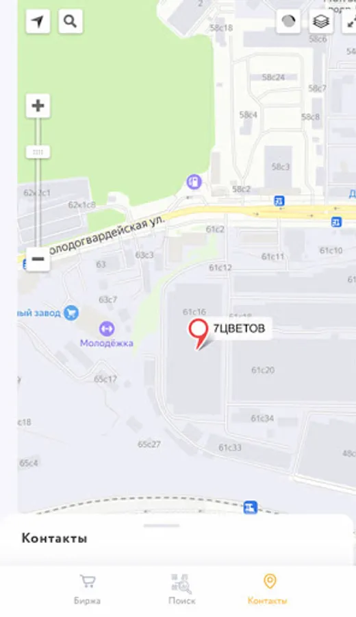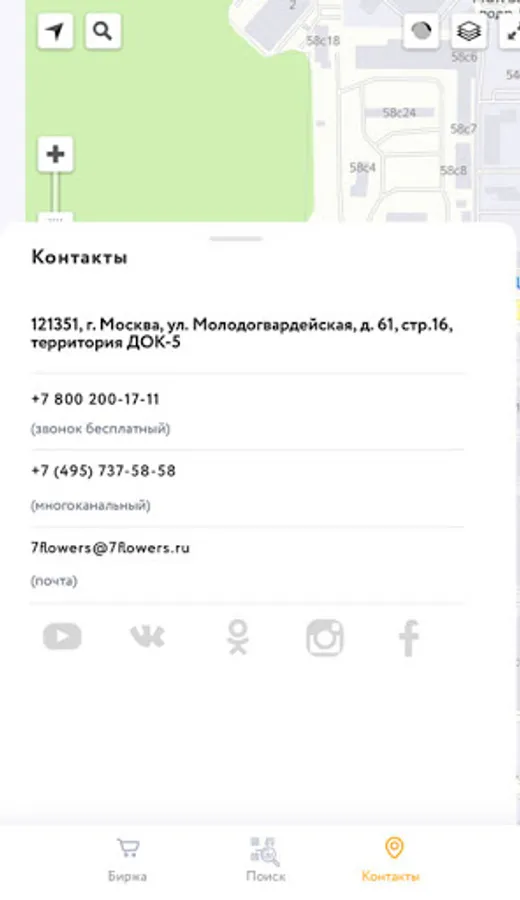 The "Contacts" section contains a map with a dot, the full address of the company, phone numbers, as well as contacts of the attached manager (when authorizing) and links to social networks.