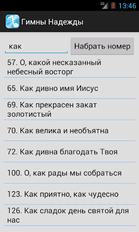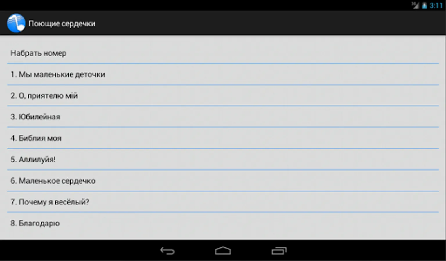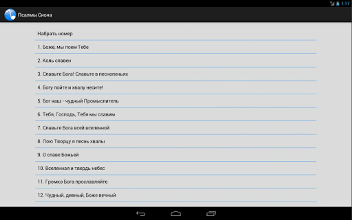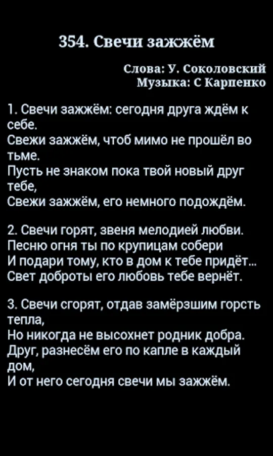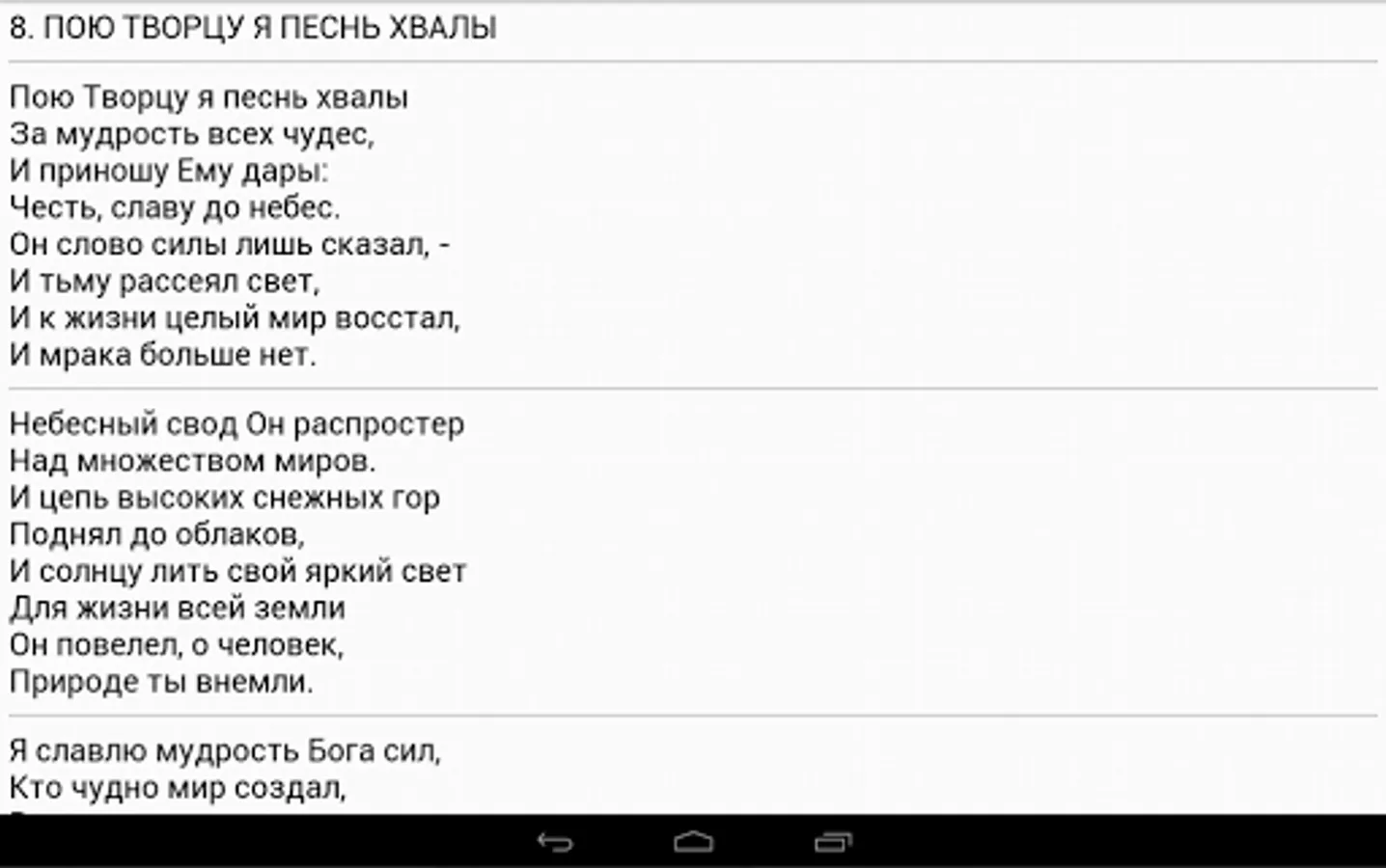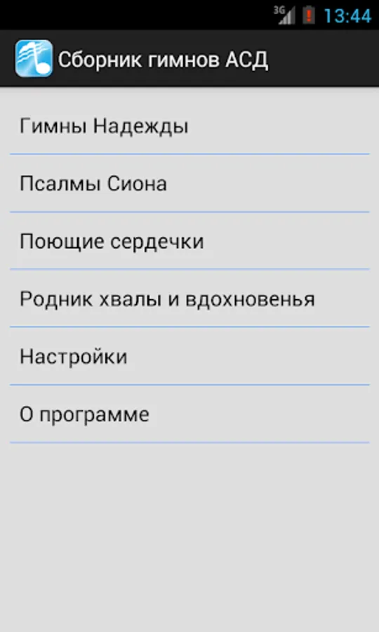The collection of Christian hymns Seventh-day Adventist Church. At this point, it includes "Hymns of Hope", "The Psalms of Zion," "Singing Heart" and "The Spring of praise and inspiration." The choice of hymns dial or scroll through the list. You can adjust the font size. There is a night mode.