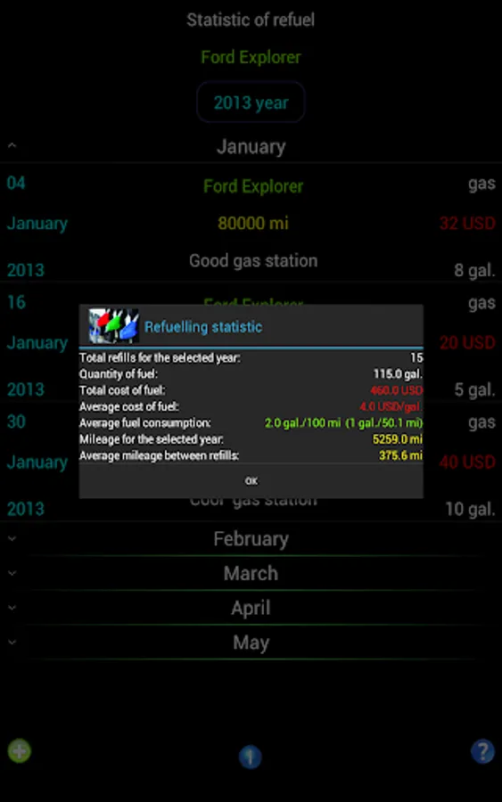 the average cost of fuel, average fuel consumption, mileage for the selected year, the average mileage between fill-ups.