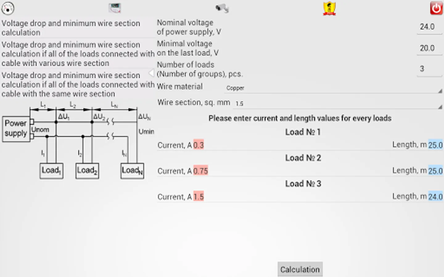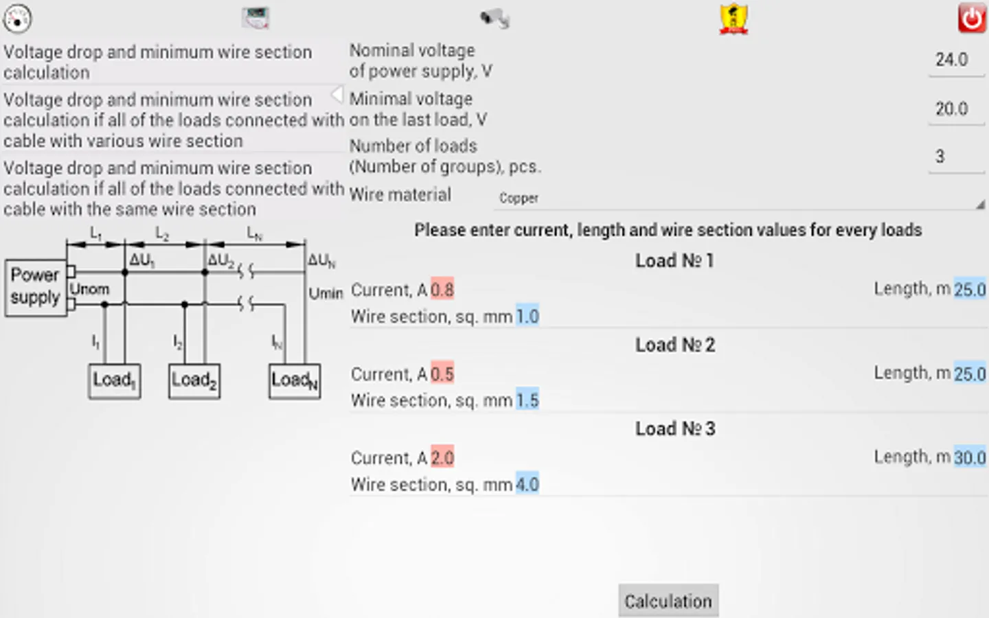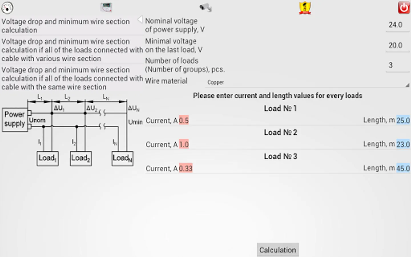 - Calculation of the voltage drop in a branched electric circuit with many loads for each load, and to determine the minimum cable wire section;
