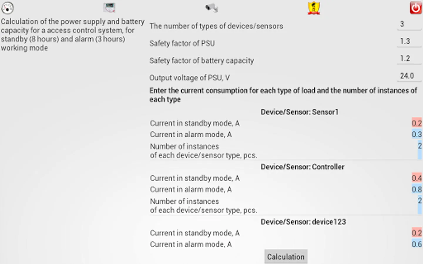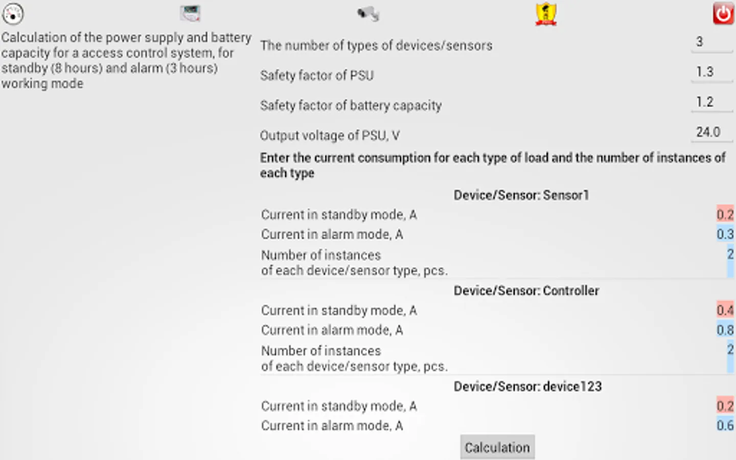 - Calculation of the power supply and battery capacity for an access control system, for standby (8 hours) and alarm (3 hours) working mode;