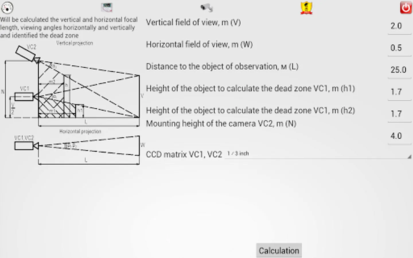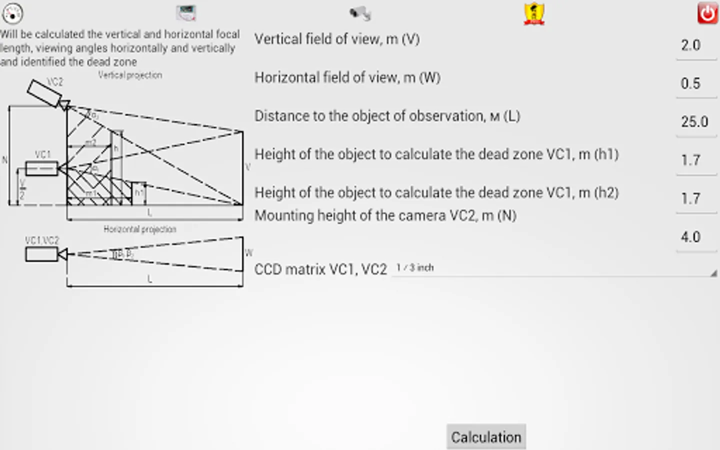 - Calculation of the camera's objective lens for surveillance video systems: determination of the vertical and horizontal focal length, definition viewing angle both vertically and horizontally, the definition of dead zones;