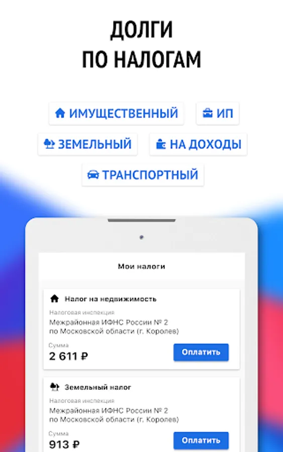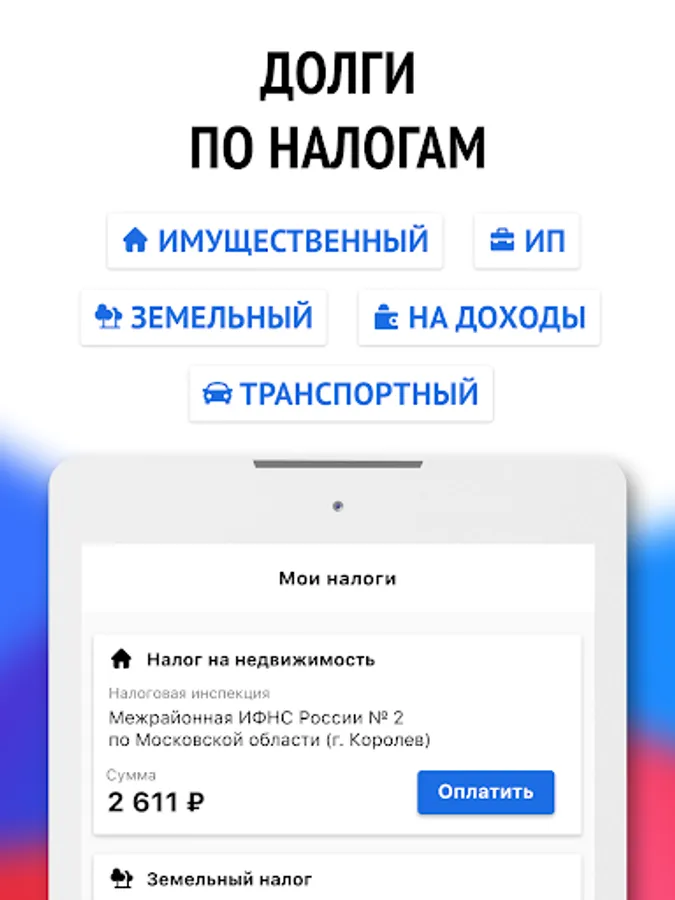 Through the application, you can find and pay the following taxes: transport tax, property tax, land tax, income tax, health insurance tax, health insurance premiums, pension insurance premiums, patent tax penalties for late payment of taxes (if they you have).