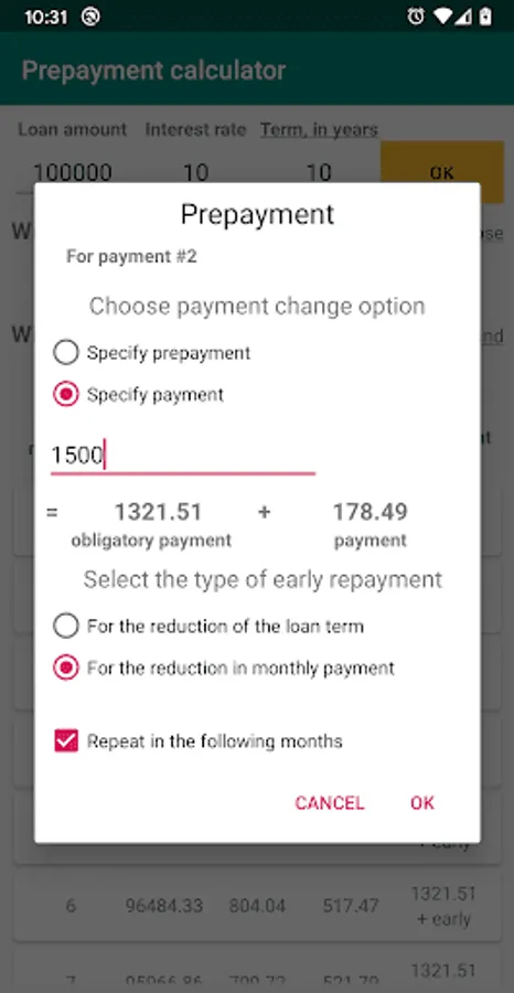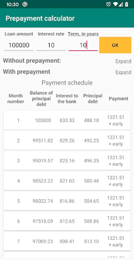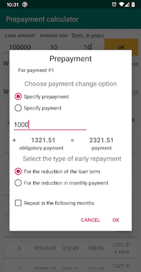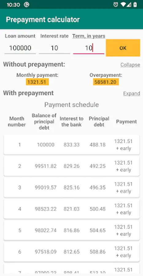 To calculate partial early repayment, click on the word "early" in the last column of the payment schedule. The calculator will then ask for information about the amount of repayment or the total monthly payment, the type of repayment (with reduced term or payment), as well as the possibility to repeat this payment before the end of the term or before the selected specific month.