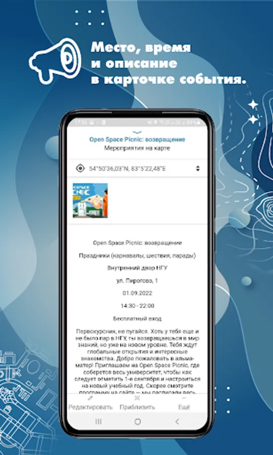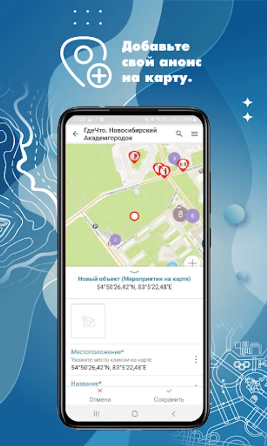 Our application is a handy tool that brings together active residents and cultural and sports grounds of the city. Get registered and invite your neighbors to a community work day, gather yard teams for a football tournament, or invite everyone to a master class. “WhereWhat” is an opportunity to place your announcement quickly and free of charge.