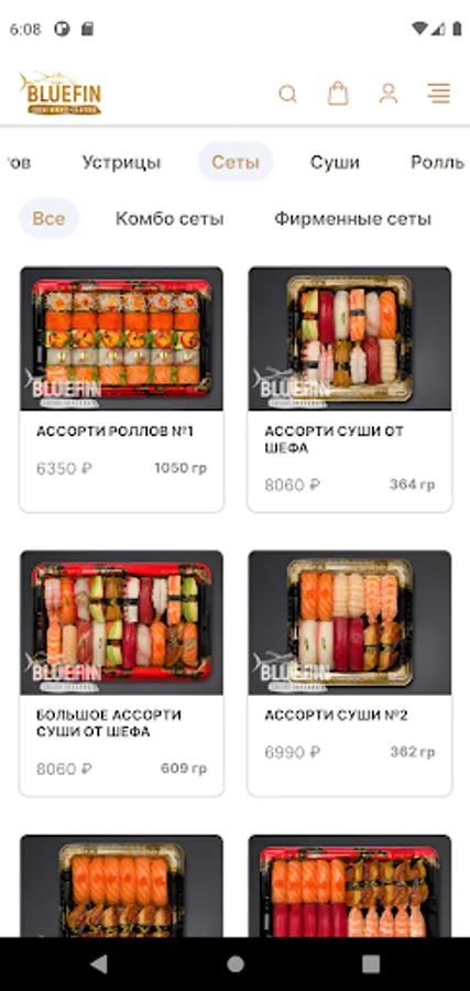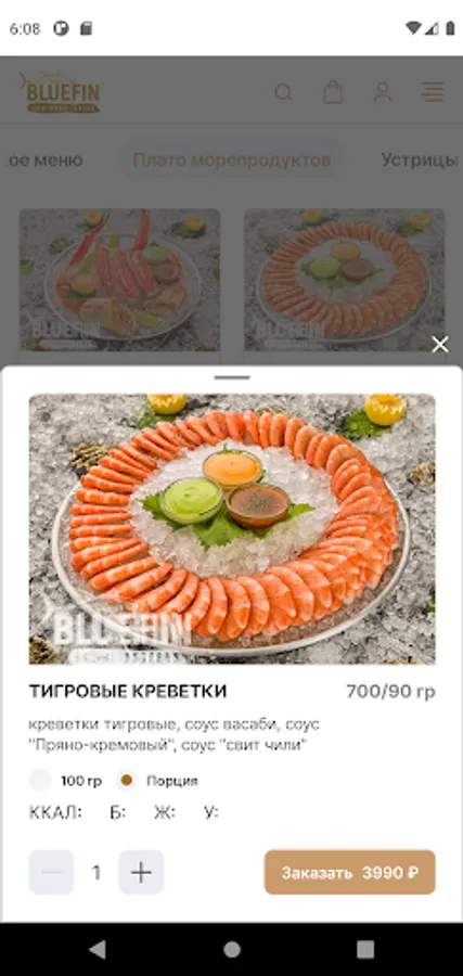 The menu includes several types of served oysters, a large selection of sushi and rolls, dishes from the abdomen of tuna toro, caviar of a sea urchin, lacedra and other sea delicacies.