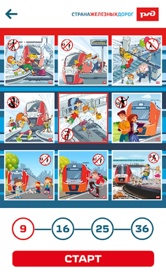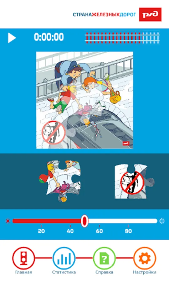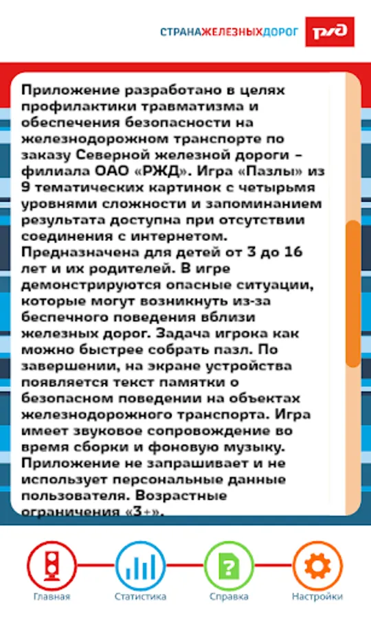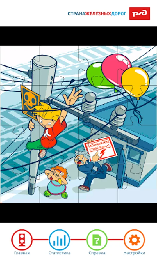The game "Puzzles" of 9 thematic pictures with four levels of difficulty and memorization of the result is available without an Internet connection. Designed for children from 3 to 16 years old and their parents. The game demonstrates dangerous situations that can arise due to careless behavior near railways.