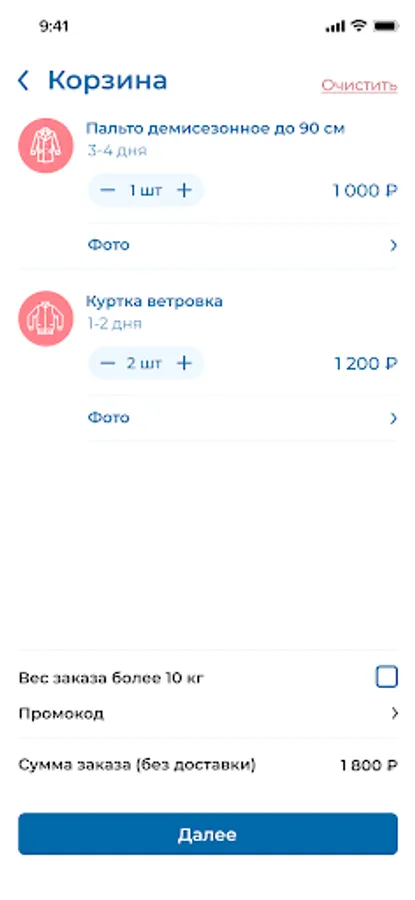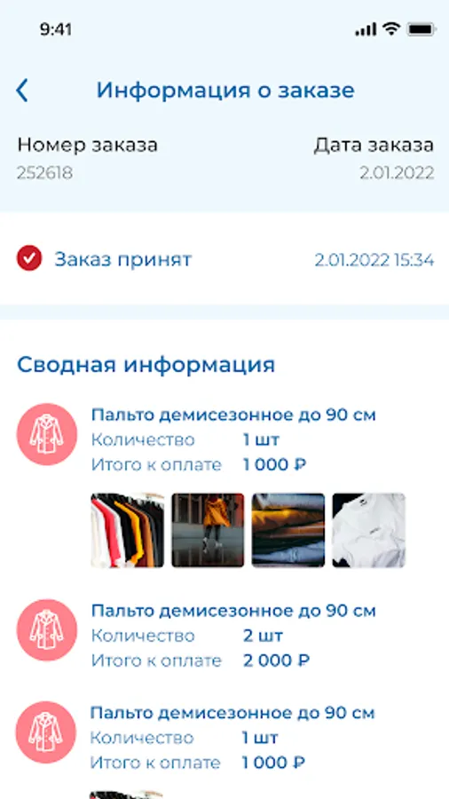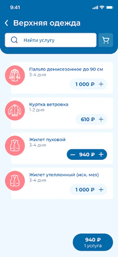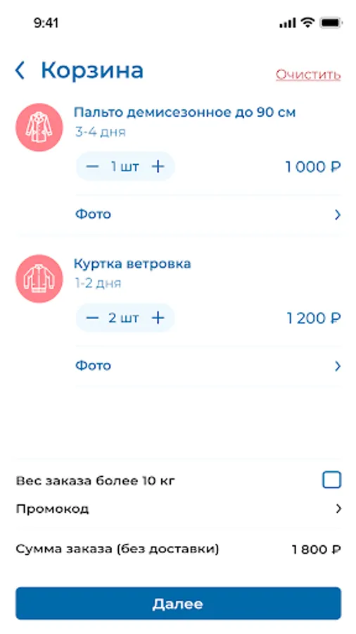 All the "unpleasant" stages of going to the dry cleaners will take place without your participation. The courier will pick up and return your things at a convenient time and place. No traffic jams, no queues, and no waiting for each item to be inspected. Before executing the order, you only need to confirm the list of services and their cost.